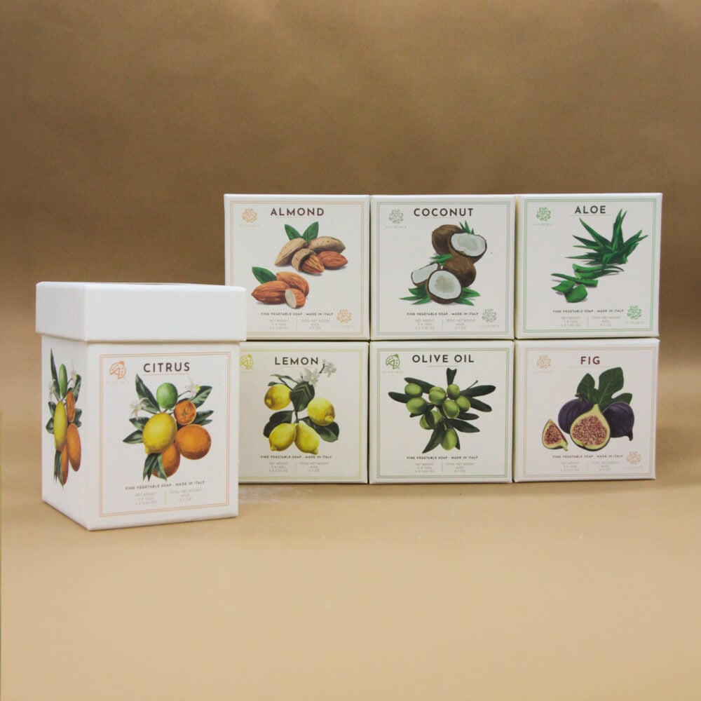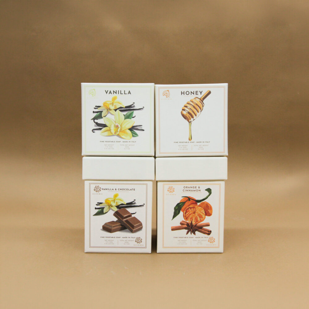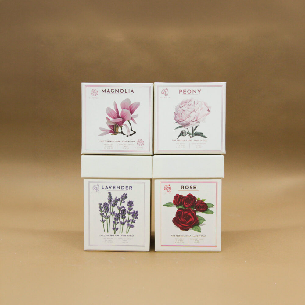 Set di 3 saponi da 150 g confezionati in box di cartone.